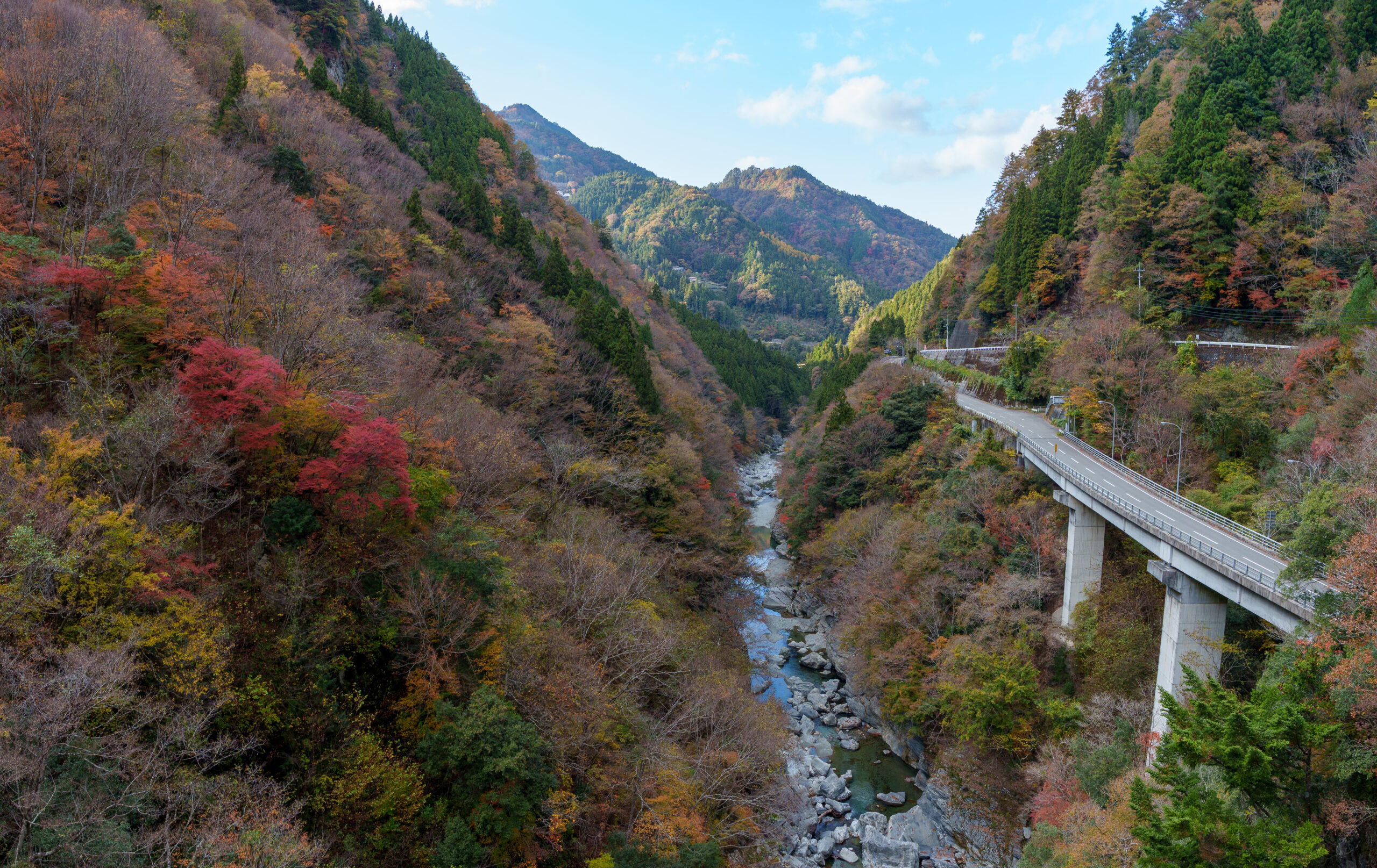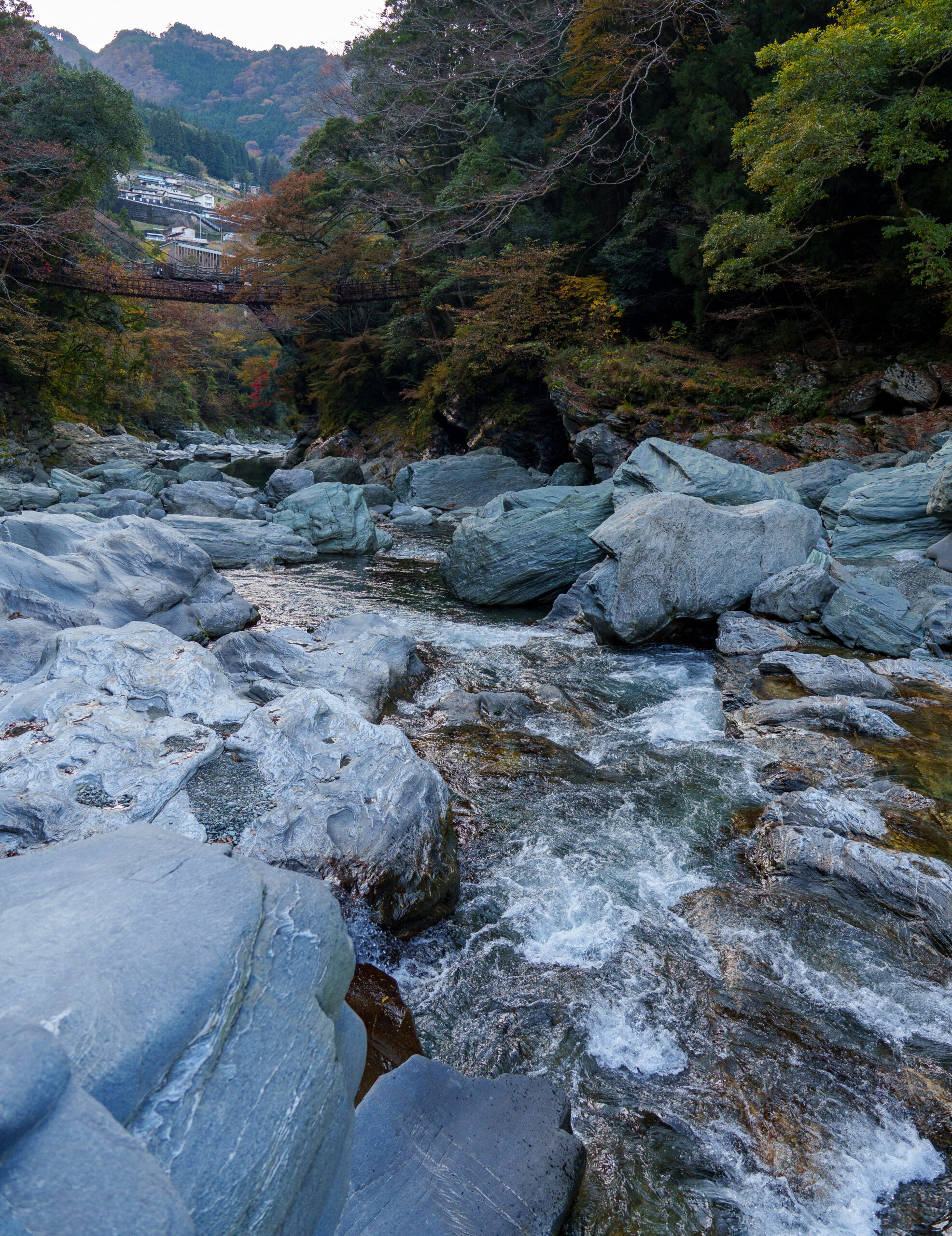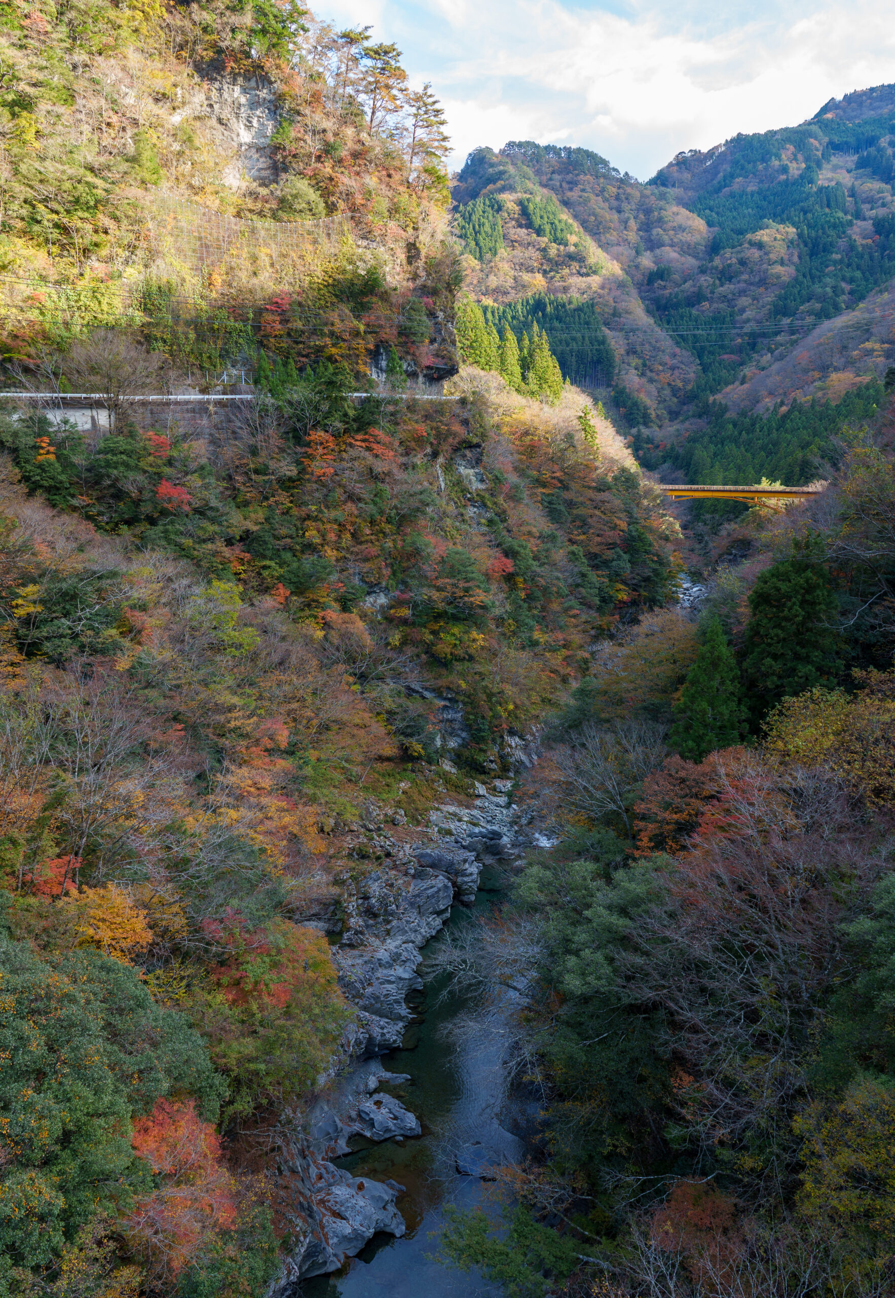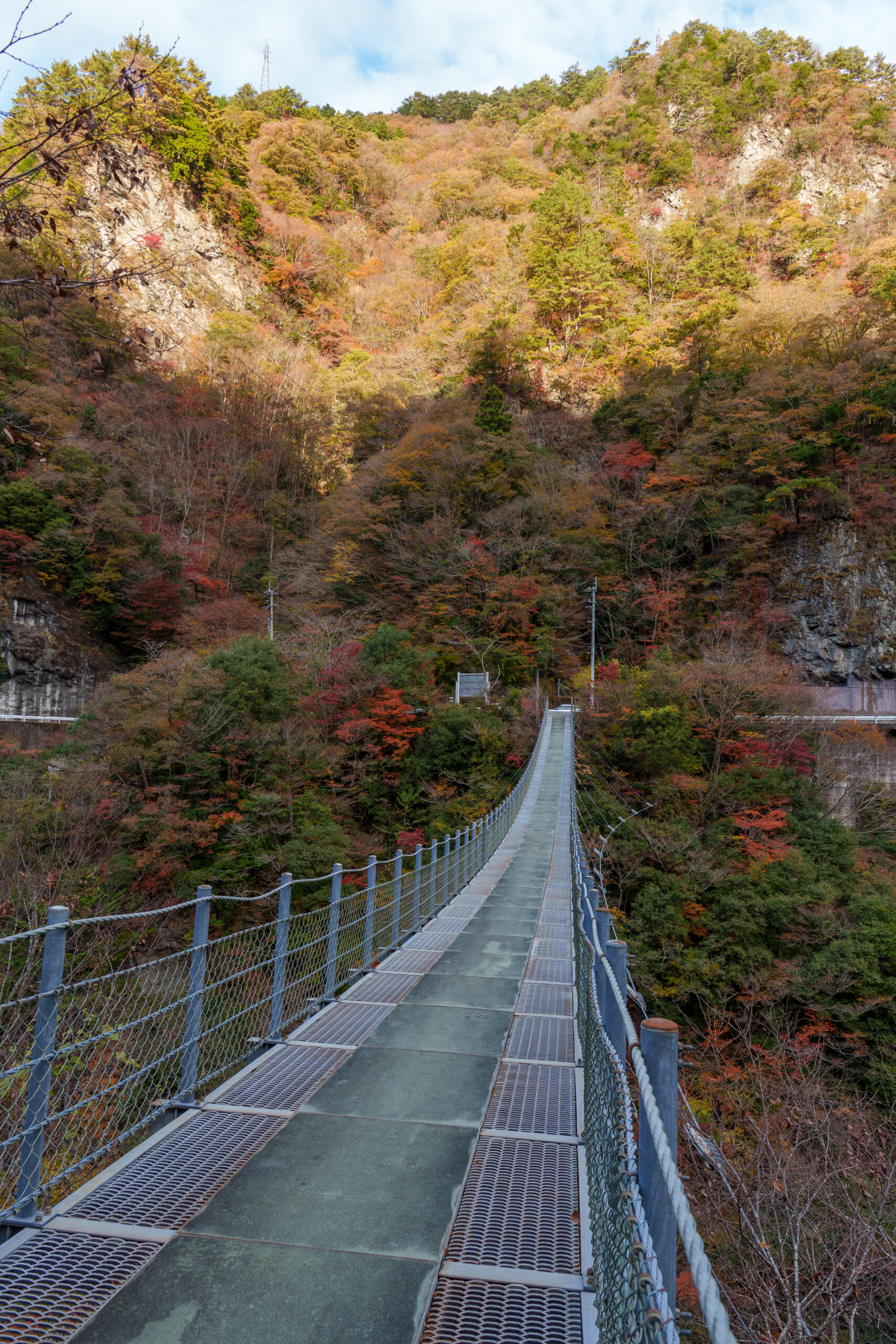 As we continued our way back through the valley, we stopped at Ryugo Cliffs Suspension Bridge. This time it was a modern metal bridge, very high across the valley with some nice autumn colours.