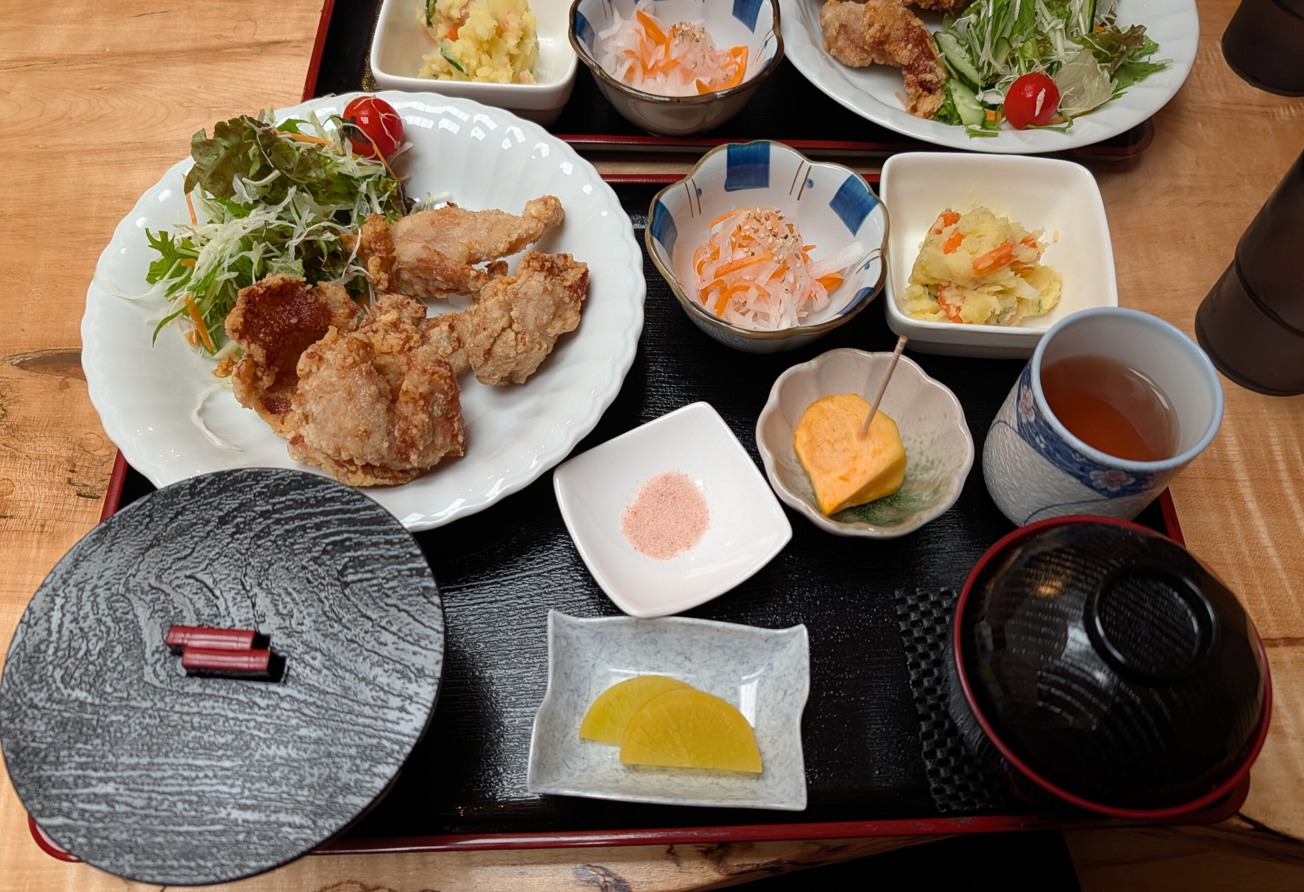 It was now lunchtime and luckily there was one restaurant in the area serving simple set meals. We both had the Karaage set meal which came with various small sides, plus rice and miso soup.