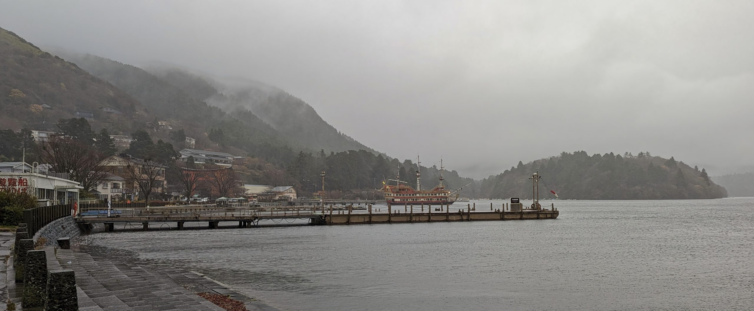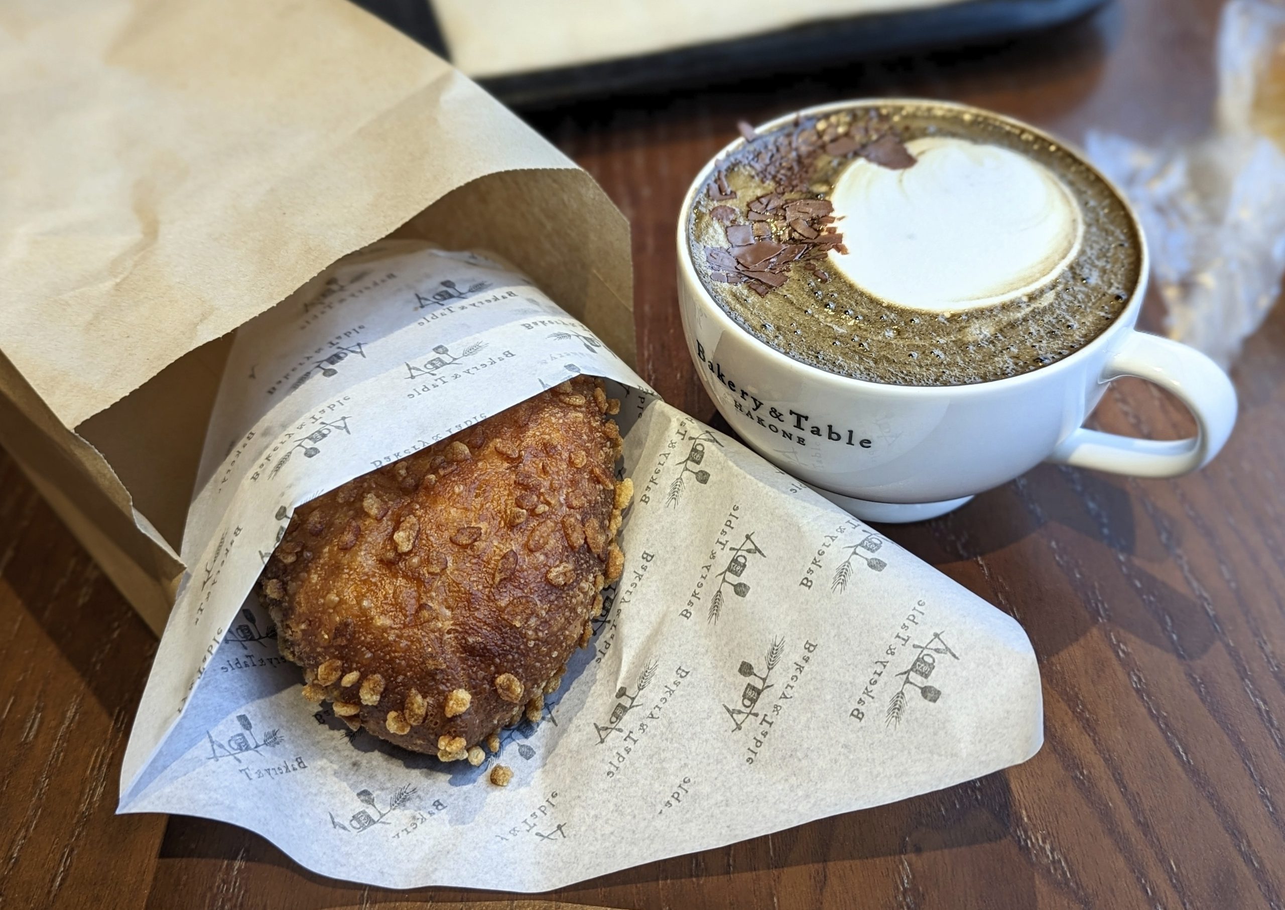 The rain and wind were getting rather too strong and we were now soaked, so rather than our planned walk along the Old Tokaido Trail to a tea house, we made our way back along the lake edge towards the buses. We stopped along the way for a tasty Curry Pan and Hojicha Latte at Bakery and Table. The cafe floor has great views looking out over Lake Ashi.
